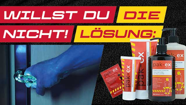 Pak-ex entfernt mehr als 96 % der krebserregenden PAK (polyzyklische aromatische Kohlenwasserstoffe), die bei Brandeinsätzen entstehen können. Es basiert auf Tonmineralien und enthält keine Penetrationsverstärker, die die Hautbarriere beeinträchtigen wie z. B. Seifen, wodurch noch mehr der Gefahrstoffe über die Haut aufgenommen werden können. Pak-ex ist parfümfrei und sehr gut hautverträglich.